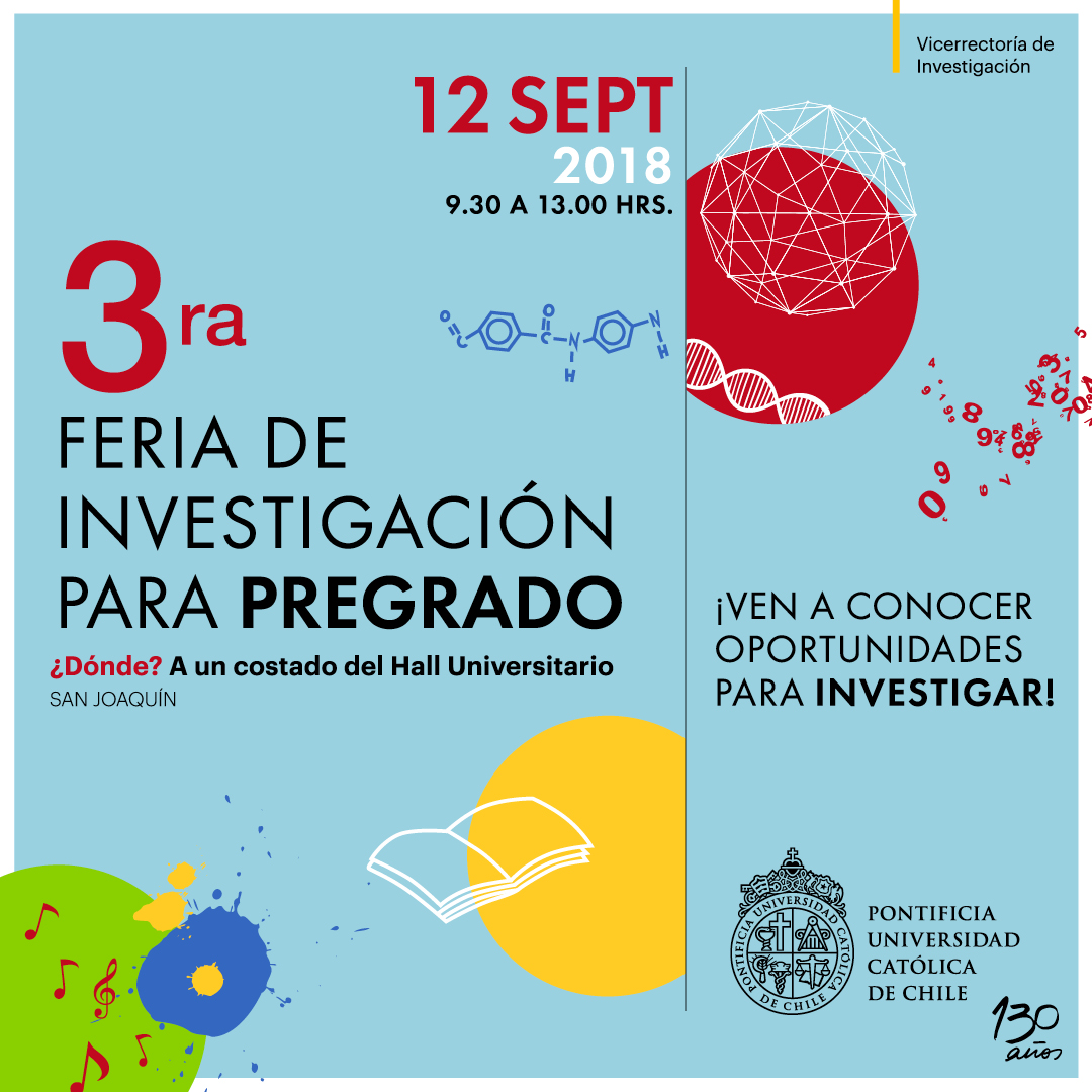 La 3ª Feria de Investigación de Pregrado 2018, se llevará a cabo este próximo 12 de septiembre a partir de las 09:30 hrs. a un costado del Hall Universitario, Campus San Joaquín.