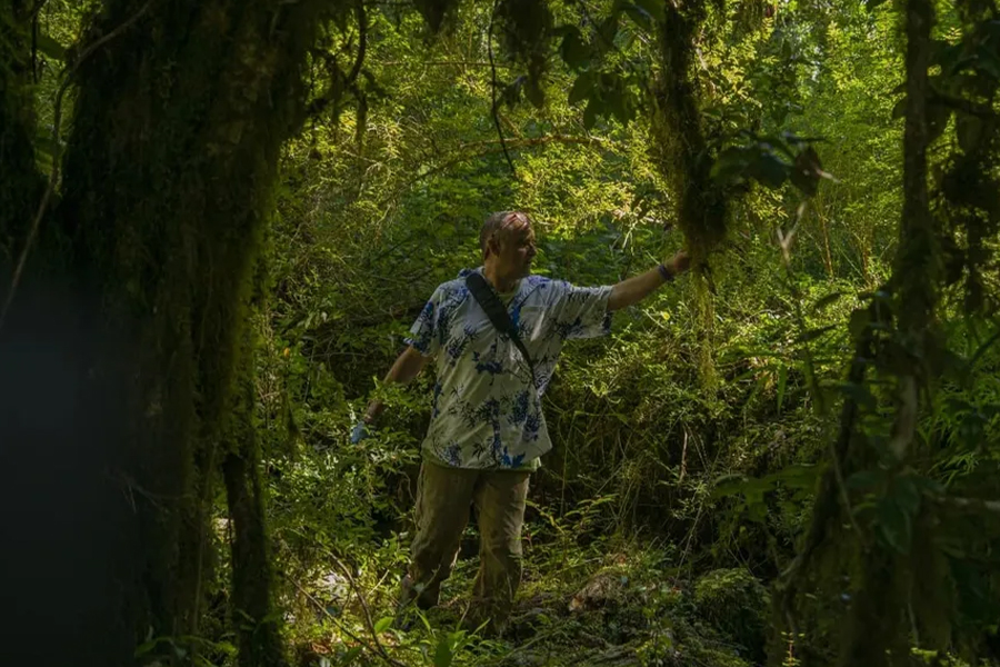 Andrés Charrier en el Parque Pumalín a finales de marzo, trabajando junto al fotógrafo Kurt Ruiz en el programa de anfibios de la Fundación Rewilding. Foto: Kurt Ruiz @patagowild_photography