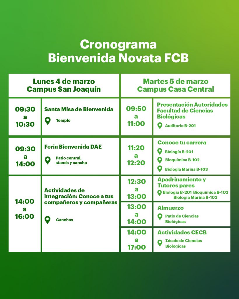 Para comenzar este viaje, te invitamos a que seas parte de las siguientes actividades para que conozcas la FCB y a tus compañeros y compañeras de carrera. Tu participación es muy importante, ya que esta es una instancia para conocer a todo el equipo que te va acompañar durante tu periodo universitario.