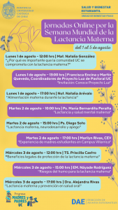 Eventos en agosto 1, 2022 Búsqueda y navegació de vistas de Eventos Show Eventos Search Búsqueda de Eventos Día de Buscar Navegación de vistas de Evento Ver como ListaMesDía « Día anterior Siguiente día » 12:00 pm Semana Mundial de la Lactancia Materna agosto 1, 2022 @ 12:00 pm - agosto 5, 2022 @ 5:00 pm Online, Online Más información » + Exportar Eventos