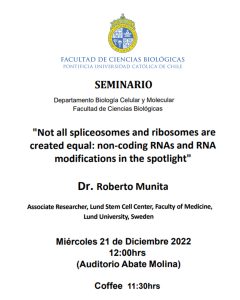 Eventos en diciembre 21, 2022 Búsqueda y navegació de vistas de Eventos Show Eventos Search Búsqueda de Eventos Día de Buscar Navegación de vistas de Evento Ver como ListaMesDía « Día anterior Siguiente día » Todo el Día Encuesta docente 2do Semestre 2022 noviembre 11, 2022 - diciembre 31, 2022 Online, Online Más información » Microscopio OpenFlexure: Desarrollo y aplicaciones noviembre 22, 2022 - diciembre 23, 2022 Campus San Joaquín, Campus San Joaquín Más información » Cenas de Navidad: Todos somos partes de esta mesa diciembre 21, 2022 - diciembre 26, 2022 Online Online Más información » En marcha Mujeres en ciencia, tecnología e innovación diciembre 1, 2022 @ 8:00 am - enero 23, 2023 @ 7:00 pm Online, Online Más información » 12:00 pm Not all spliceosomes and ribosomes are created equal: non-coding RNAs and RNA modications in the spotlight diciembre 21, 2022 @ 12:00 pm - 1:00 pm Auditorio Abate Molina, Auditorio Abate Molina Más información » + Exportar Eventos