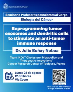 Eventos en agosto 28, 2023 Búsqueda y navegació de vistas de Eventos Show Eventos Search Búsqueda de Eventos Día de Buscar Navegación de vistas de Evento Ver como ListaMesDía « Día anterior Siguiente día » 12:30 pm Reprogramming tumor exosomes and dendritic cells to stimulate an anti-tumor immune response agosto 28, 2023 @ 12:30 pm - 2:00 pm Online, Online Más información » + Exportar Eventos