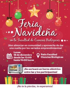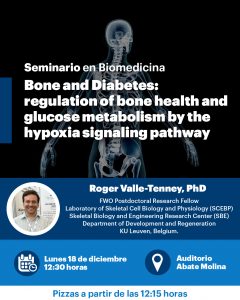 Eventos en diciembre 18, 2023 Búsqueda y navegació de vistas de Eventos Show Eventos Search Búsqueda de Eventos Día de Buscar Navegación de vistas de Evento Ver como ListaMesDía « Día anterior Siguiente día » 12:30 pm Bone and Diabetes: regulation of bone health and glucose metabolism by the hypoxia signaling pathway diciembre 18, 2023 @ 12:30 pm - 1:30 pm Auditorio Abate Molina, Auditorio Abate Molina Más información » 1:00 pm Feria Navideña en la Facultad de Ciencias Biológicas diciembre 18, 2023 @ 1:00 pm - 3:00 pm Campus Casa Central, Campus Casa Central Más información » + Exportar Eventos
