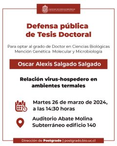 Eventos en marzo 26, 2024 Búsqueda y navegació de vistas de Eventos Show Eventos Search Búsqueda de Eventos Día de Buscar Navegación de vistas de Evento Ver como ListaMesDía « Día anterior Siguiente día » 2:30 pm Defensa pública de Tesis Doctoral: Relación virus-hospedero en ambientes termales marzo 26, 2024 @ 2:30 pm - 3:30 pm Auditorio Abate Molina, Auditorio Abate Molina Más información » + Exportar Eventos