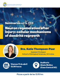 Eventos en abril 11, 2025 Búsqueda y navegació de vistas de Eventos Show Eventos Search Búsqueda de Eventos Día de Buscar Navegación de vistas de Evento Ver como ListaMesDía « Día anterior Siguiente día » 12:00 pm Seminario “Neuron regeneration after injury: cellular mechanisms of dendrite regrowth” abril 11 @ 12:00 pm - 2:00 pm Auditorio Abate Molina, Auditorio Abate Molina Más información » 12:30 pm Votación Concurso de Arte Microbiológico abril 11 @ 12:30 pm - abril 25 @ 8:00 pm Online, Online Más información » + Exportar Eventos