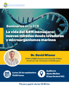 Eventos en septiembre 22, 2025 Búsqueda y navegació de vistas de Eventos Show Eventos Search Búsqueda de Eventos Día de Buscar Navegación de vistas de Evento Ver como ListaMesDía « Día anterior Siguiente día » 12:30 pm Seminario “La vida del ARN mensajero: nuevas miradas desde levaduras y microorganismos marinos” septiembre 22 @ 12:30 pm - 2:00 pm Campus Casa Central, Campus Casa Central Más información » + Exportar Eventos