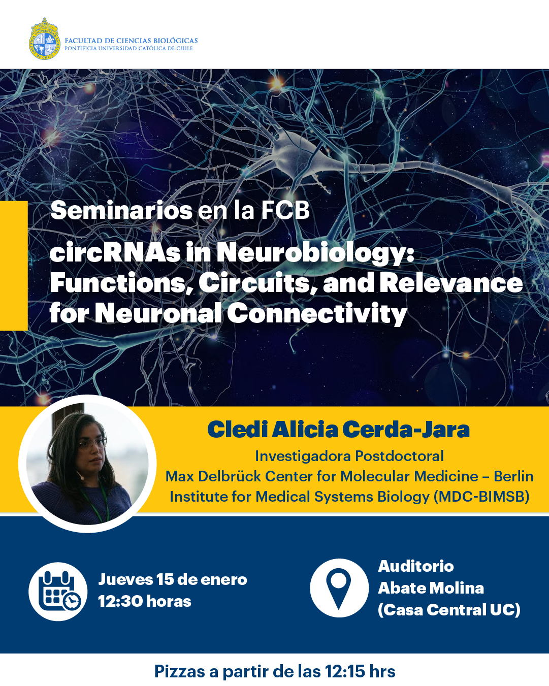 Eventos en enero 15, 2026 Búsqueda y navegació de vistas de Eventos Show Eventos Search Búsqueda de Eventos Día de Buscar Navegación de vistas de Evento Ver como ListaMesDía « Día anterior Siguiente día » En marcha Congreso Futuro: “Humanidad, ¿Hacia dónde vamos? enero 12 @ 8:00 am - enero 17 @ 5:00 pm Centro cultural CEINA Más información » 9:00 am Encuentro Internacional Ciencia + Arte 2026: La vida se abre camino enero 15 @ 9:00 am - 3:00 pm Más información » 12:30 pm Seminario “circRNAs in Neurobiology: Functions, Circuits, and Relevance for Neuronal Connectivity” enero 15 @ 12:30 pm - 2:00 pm Campus Casa Central, Campus Casa Central Más información » 3:00 pm Charla “Un océano que cambia” por el Dr. Sergio Navarrete enero 15 @ 3:00 pm - 5:00 pm Centro cultural CEINA Más información » + Exportar Eventos
