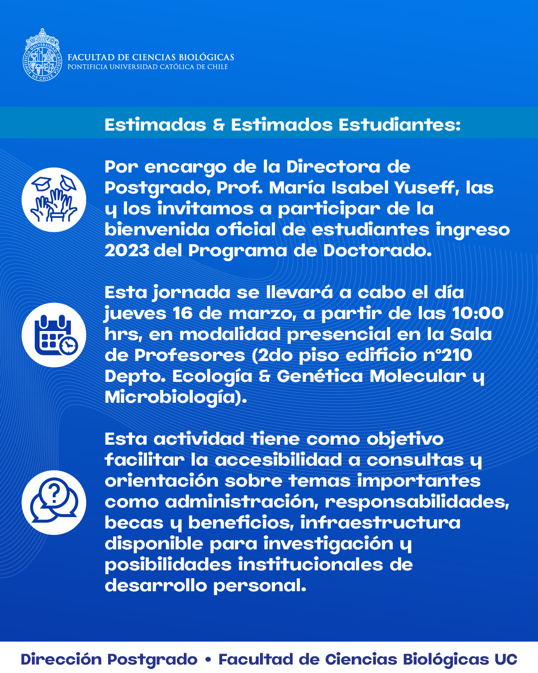 « Todos los Eventos Este evento ha pasado. Bienvenida estudiantes Programa de Doctorado 2023 marzo 16, 2023 @ 10:00 am - 3:30 pm « Charla Sin Limites Charla Magistral: Diálogos moleculares entre microorganismos y el sistema inmune mamífero en salud y enfermedad » Compartir en...FacebookPinterestTwitterLinkedin + Google Calendar+ Exportar iCal Detalles Fecha: marzo 16, 2023 Hora: 10:00 am - 3:30 pm Categoría del Evento: Calendario Portada Evento etiquetas:Postgrado Lugar Campus Casa Central Campus Casa Central