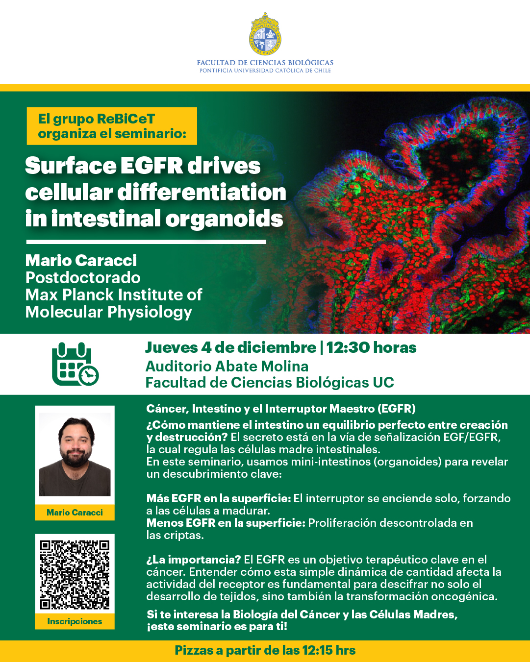 Eventos en diciembre 4, 2025 › Calendario Portada Búsqueda y navegació de vistas de Eventos Show Eventos Search Búsqueda de Eventos Día de Buscar Navegación de vistas de Evento Ver como ListaMesDía « Día anterior Siguiente día » 10:00 am Proyecto de tesis en 3 minutos diciembre 4 @ 10:00 am - 1:30 pm Campus Casa Central, Campus Casa Central Más información » 12:30 pm Seminario Rebicet: “Surface EGFR drives cellular differentiation in intestinal organoids” diciembre 4 @ 12:30 pm - 2:00 pm Campus Casa Central, Campus Casa Central Más información » + Exportar Eventos