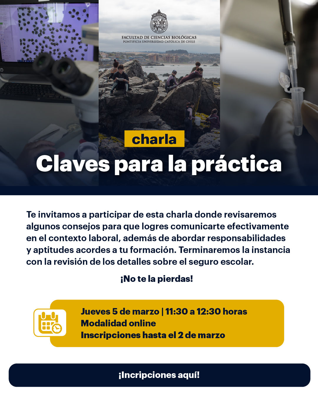 « Todos los Eventos Charla: “Claves para la práctica” marzo 5 @ 11:30 am - 12:30 pm « Bienvenida Ciencias Biológicas 2026 Compartir en...FacebookPinterestTwitterLinkedin + Google Calendar+ Exportar iCal Detalles Fecha: marzo 5 Hora: 11:30 am - 12:30 pm Categoría del Evento: Calendario Portada Evento etiquetas:Pregrado Lugar Online Online