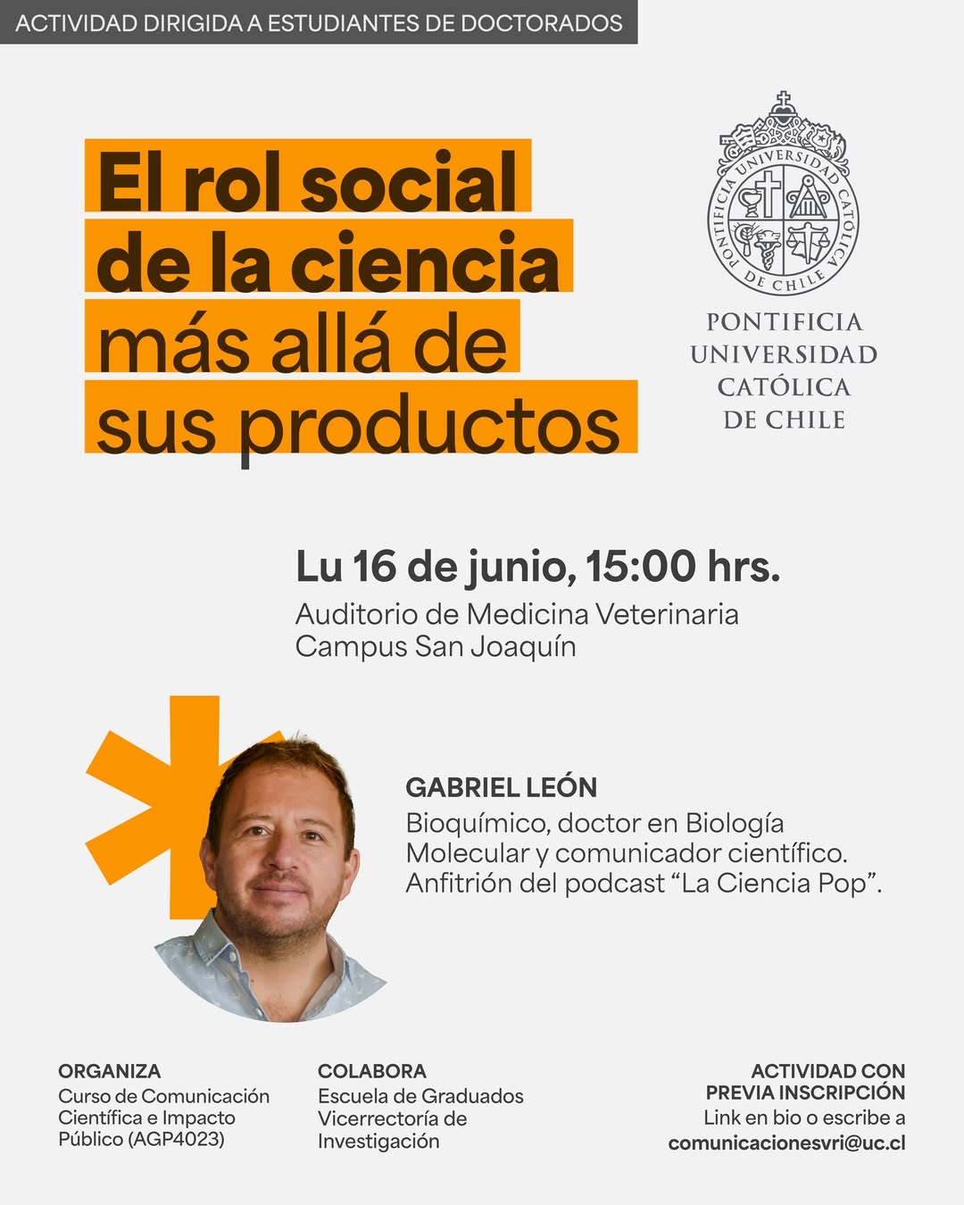 « Todos los Eventos Este evento ha pasado. Charla “El rol social de la ciencia más allá de sus productos” con Gabriel León junio 16 @ 3:00 pm - 4:30 pm « Seminario “Translating pre-clinical sleep studies to improve metabolic outcomes” Charla online “Expediciones submarinas de arrecifes semiprofundos de la Patagonia, Chile Central y las Islas Galápagos” » Compartir en...FacebookPinterestTwitterLinkedin + Google Calendar+ Exportar iCal Detalles Fecha: junio 16 Hora: 3:00 pm - 4:30 pm Categoría del Evento: Calendario Portada Evento etiquetas:Doctorado Lugar Campus San Joaquín Campus San Joaquín