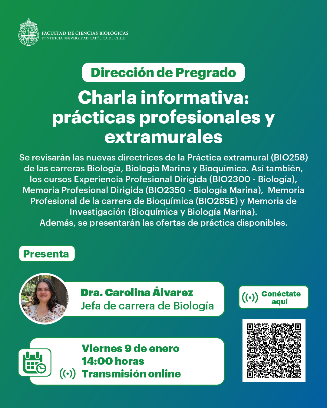 « Todos los Eventos Charla informativa: practicas profesionales y extramurales enero 9, 2026 @ 2:00 pm - 3:30 pm « Feria de orientación y postulación UC Congreso Futuro: “Humanidad, ¿Hacia dónde vamos? » Compartir en...FacebookPinterestTwitterLinkedin + Google Calendar+ Exportar iCal Detalles Fecha: enero 9, 2026 Hora: 2:00 pm - 3:30 pm Categoría del Evento: Calendario Portada Evento etiquetas:Pregrado Lugar Online Online