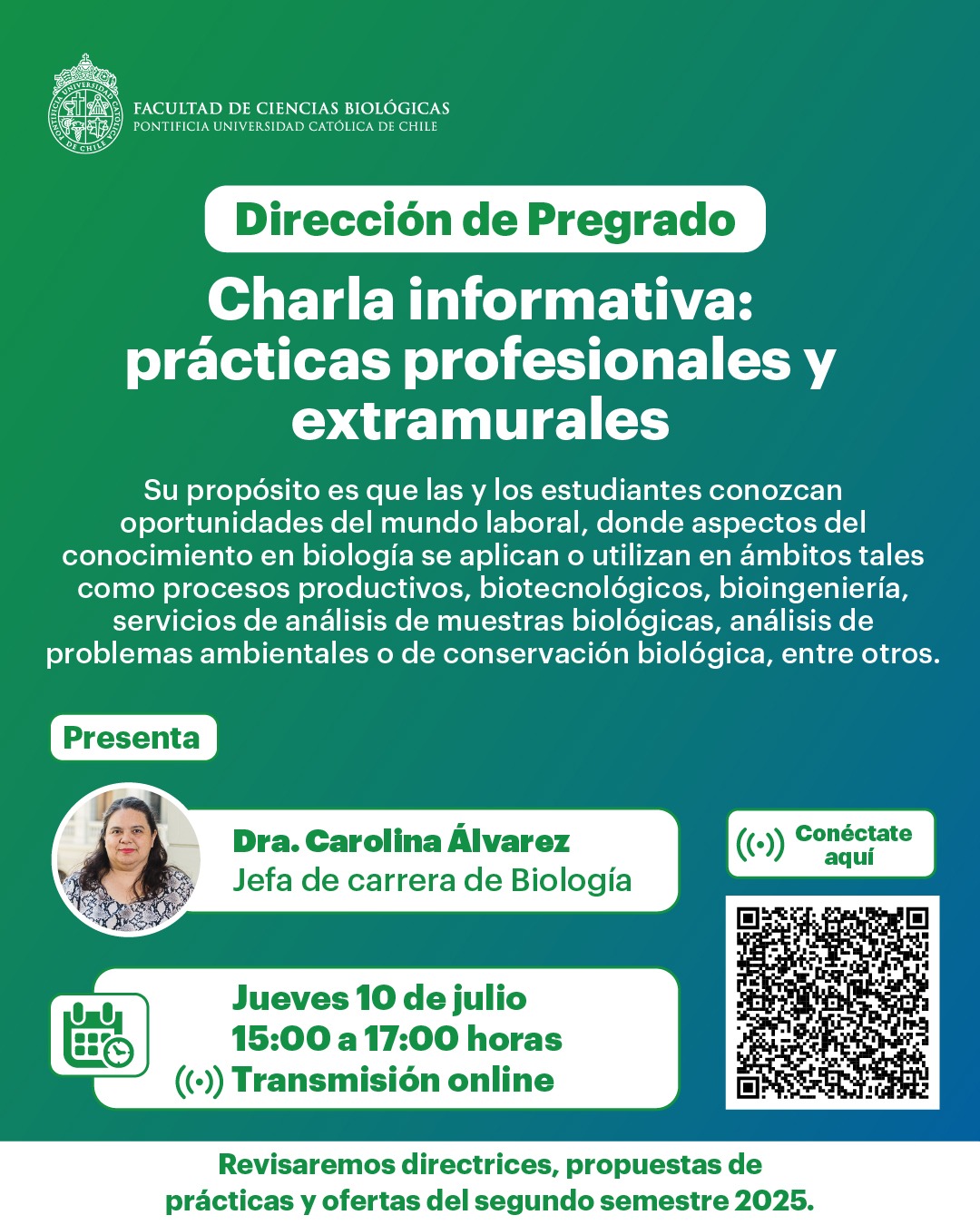 « Todos los Eventos Este evento ha pasado. Charla online: prácticas profesionales y extramurales julio 10 @ 3:00 pm - 7:00 pm « Seminario “Bacteriofagos: aliados en la lucha contra la resistencia antimicrobiana” Convocatoria ayudantías segundo semestre 2025 » Compartir en...FacebookPinterestTwitterLinkedin + Google Calendar+ Exportar iCal Detalles Fecha: julio 10 Hora: 3:00 pm - 7:00 pm Categoría del Evento: Calendario Portada Evento etiquetas:Pregrado Lugar Online Online