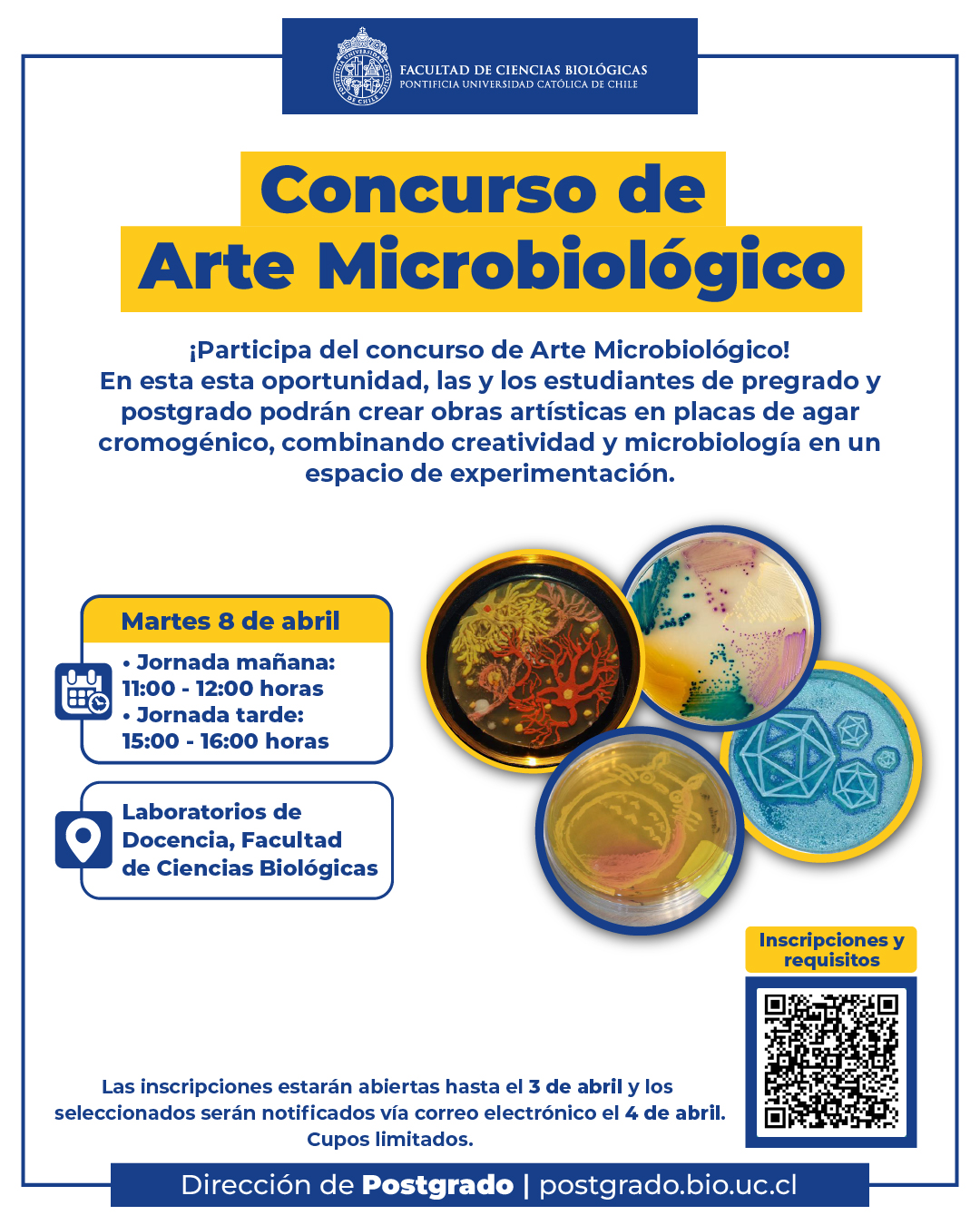 « Todos los Eventos Este evento ha pasado. Concurso de Arte Microbiológico abril 8 @ 11:00 am - 4:00 pm « Seminario “From biology to patient care: the tumor microenvironment as a key driver in cancer prognosis and treatment” Seminario híbrido: “Aprendizajes y oportunidades para la restauración de paisajes en Chile” » Compartir en...FacebookPinterestTwitterLinkedin + Google Calendar+ Exportar iCal Detalles Fecha: abril 8 Hora: 11:00 am - 4:00 pm Categoría del Evento: Calendario Portada Evento etiquetas:Concurso Lugar Facultad de Ciencias Biológicas
