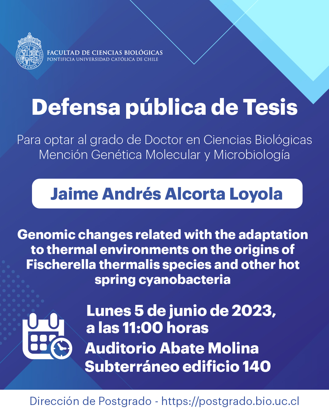 « Todos los Eventos Este evento ha pasado. Defensa Pública de Tesis de Jaime Alcorta Loyola junio 5, 2023 @ 11:00 am - 12:00 pm « Seminario: Un viaje al pasado para comprender el origen de la esquizofrenia Defensa Pública de Tesis de María Belén Gallardo » Compartir en...FacebookPinterestTwitterLinkedin + Google Calendar+ Exportar iCal Detalles Fecha: junio 5, 2023 Hora: 11:00 am - 12:00 pm Categoría del Evento: Calendario Portada Evento etiquetas:Postgrado Lugar Auditorio Abate Molina Auditorio Abate Molina