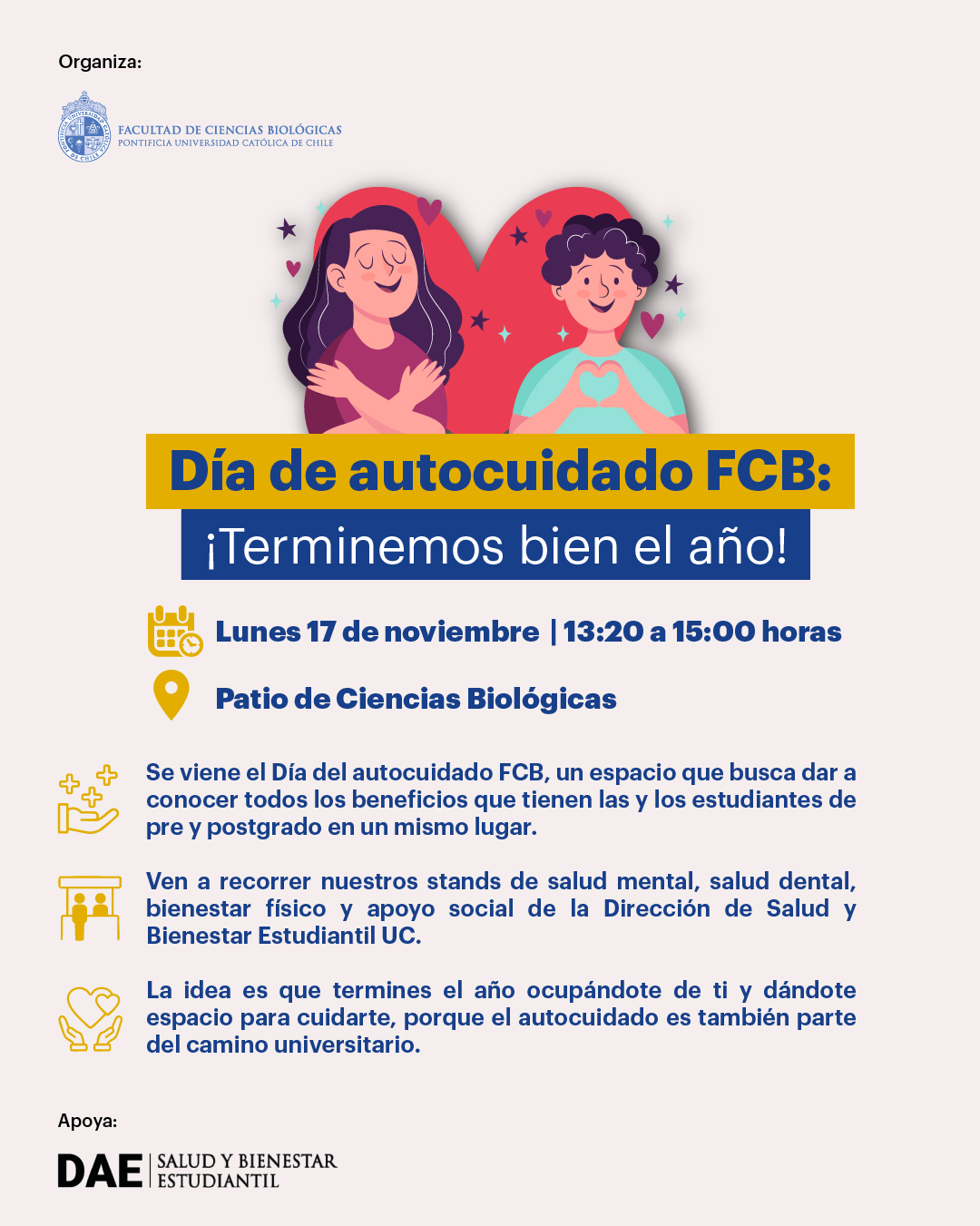 « Todos los Eventos Este evento ha pasado. Día del autocuidado FCB noviembre 17 @ 1:30 pm - 3:00 pm « Seminario “Is protein synthesis a local brake for the regeneration of cortical axons?” Feria laboral “Ciencias UC” » Compartir en...FacebookPinterestTwitterLinkedin + Google Calendar+ Exportar iCal Detalles Fecha: noviembre 17 Hora: 1:30 pm - 3:00 pm Categoría del Evento: Calendario Portada Evento etiquetas:Comunidad FCB Lugar Campus Casa Central Campus Casa Central