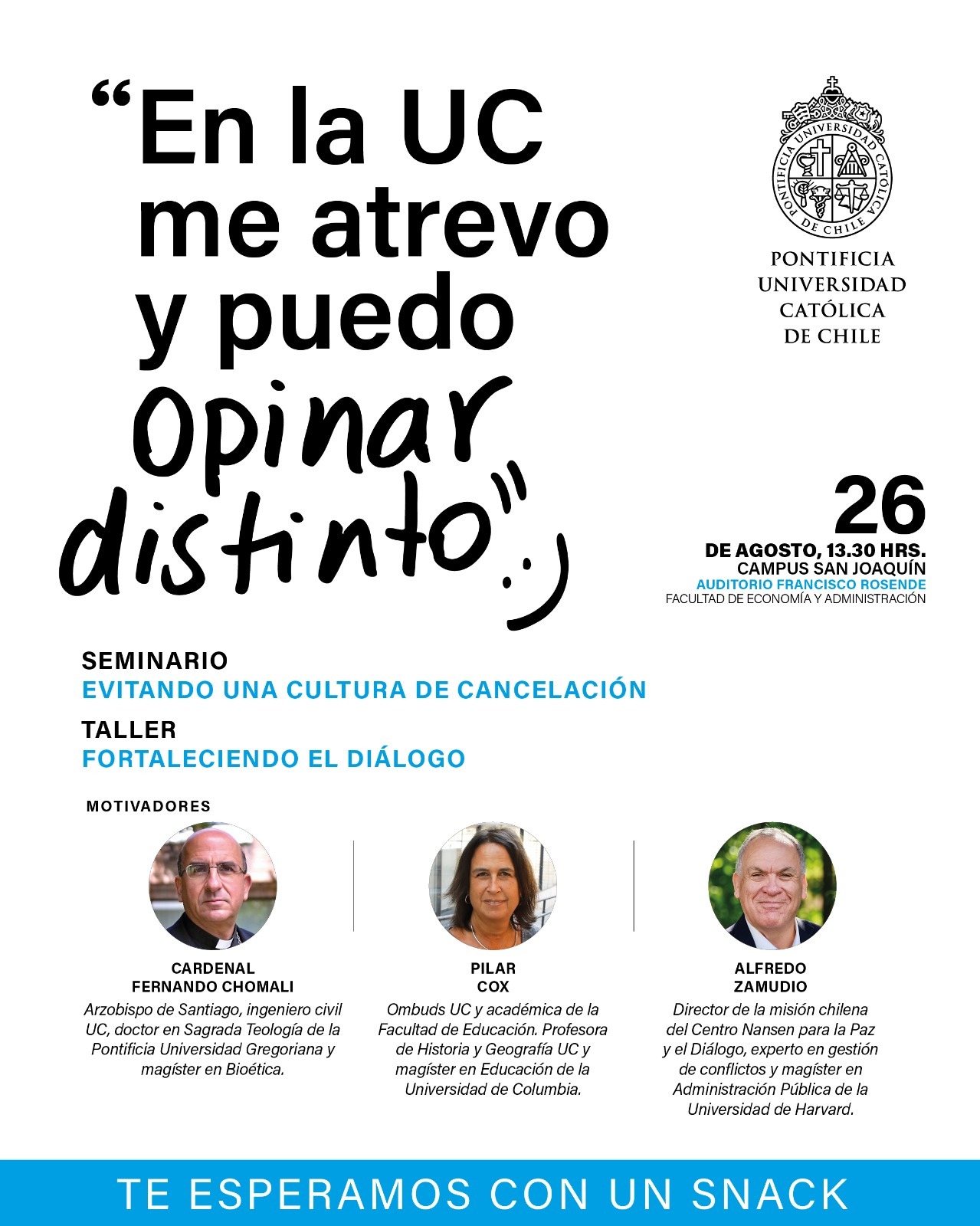 « Todos los Eventos Este evento ha pasado. Diálogo Universitario: “En la UC me atrevo y puedo opinar distinto” agosto 26 @ 1:30 pm - 3:30 pm « Jornada de Grupo Enfermedades Poco Frecuentes UC: sesión de posters y conversatorio Seminario “Patrimonio natural de la comuna de Purranque: una mirada a la biodiversidad del sur de Chile” » Compartir en...FacebookPinterestTwitterLinkedin + Google Calendar+ Exportar iCal Detalles Fecha: agosto 26 Hora: 1:30 pm - 3:30 pm Categoría del Evento: Calendario Portada Evento etiquetas:Comunidad UC Lugar Campus San Joaquín Campus San Joaquín