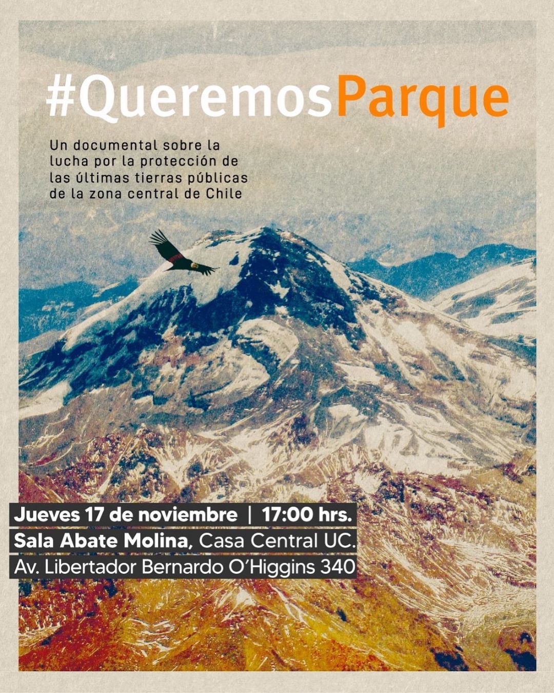 « Todos los Eventos Este evento ha pasado. Documental: “Queremos Parque” noviembre 17, 2022 @ 5:00 pm - 6:30 pm « Taller de escritura académica Entre la tierra y el mar » Compartir en...FacebookPinterestTwitterLinkedin + Google Calendar+ Exportar iCal Detalles Fecha: noviembre 17, 2022 Hora: 5:00 pm - 6:30 pm Categoría del Evento: Calendario Portada Evento etiquetas:CAPES Página Web: https://capes.cl/2022/11/exhibicion-documental-queremos-parque/ Lugar Auditorio Abate Molina Auditorio Abate Molina Organizador CAPES