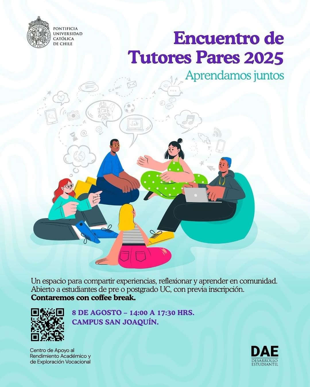 « Todos los Eventos Este evento ha pasado. Encuentro de tutores pares 2025 agosto 8 @ 2:00 pm - 5:30 pm « Seminario “El rol de SPARC en la remodelación celular y extracelular en lesión de medula espinal: implicancias para cicatrización mediada por astrocitos” Taller de metodologías participativas para vinculación con comunidades educativas » Compartir en...FacebookPinterestTwitterLinkedin + Google Calendar+ Exportar iCal Detalles Fecha: agosto 8 Hora: 2:00 pm - 5:30 pm Categoría del Evento: Calendario Portada Evento etiquetas:Estudiantes UC Lugar Campus San Joaquín Campus San Joaquín