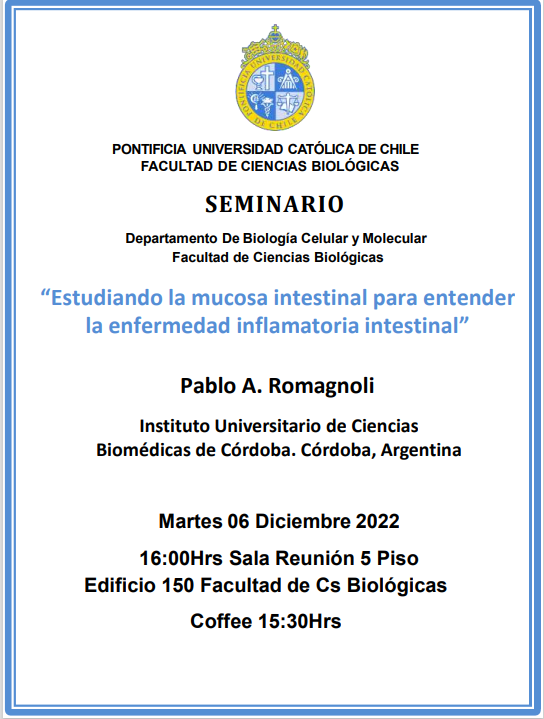« Todos los Eventos Este evento ha pasado. Estudiando la mucosa intestinal para entender la enfermedad inflamatoria intestinal diciembre 6, 2022 @ 4:00 pm - 5:00 pm « XLIII Congreso anual de la sociedad de farmacología de Chile Seminario: Reconocimiento y Trayectoria UC » Compartir en...FacebookPinterestTwitterLinkedin + Google Calendar+ Exportar iCal Detalles Fecha: diciembre 6, 2022 Hora: 4:00 pm - 5:00 pm Categoría del Evento: Calendario Portada Evento etiquetas:Pablo A. Romagnoli Lugar Auditorio Abate Molina Auditorio Abate Molina