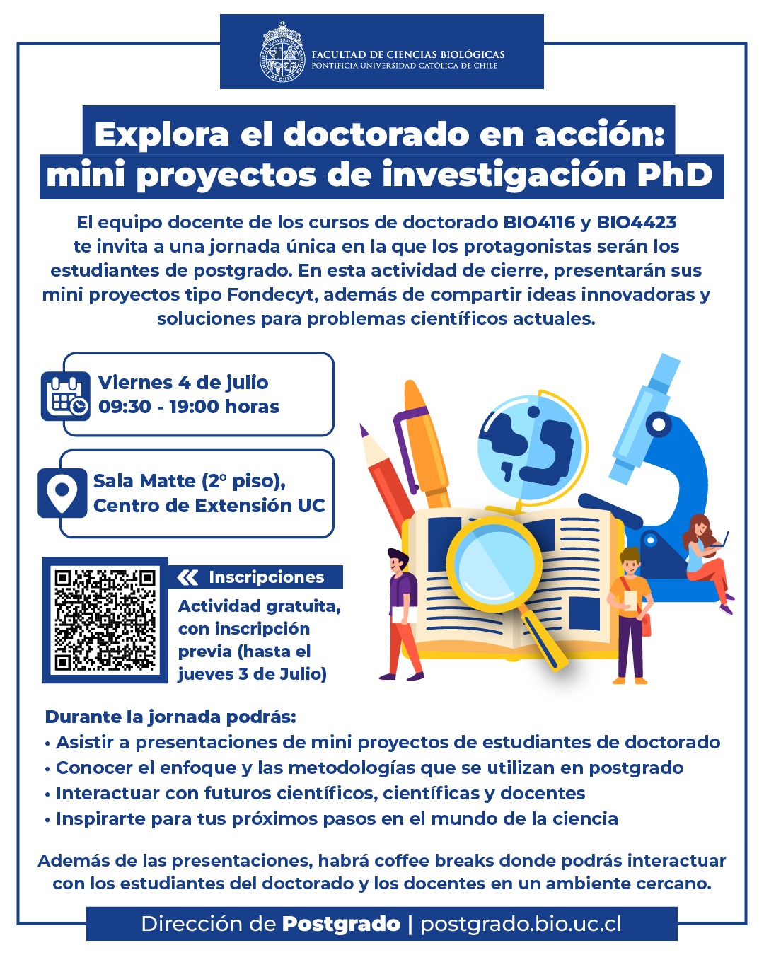 « Todos los Eventos Este evento ha pasado. Explora el doctorado en acción: mini proyectos de investigación PhD julio 4 @ 9:30 am - 7:00 pm « Presentación de los Seminarios de Investigación Biológica BIO296 Seminario “Bacteriofagos: aliados en la lucha contra la resistencia antimicrobiana” » Compartir en...FacebookPinterestTwitterLinkedin + Google Calendar+ Exportar iCal Detalles Fecha: julio 4 Hora: 9:30 am - 7:00 pm Categoría del Evento: Calendario Portada Evento etiquetas:Estudiantes UC Lugar Campus Casa Central Campus Casa Central