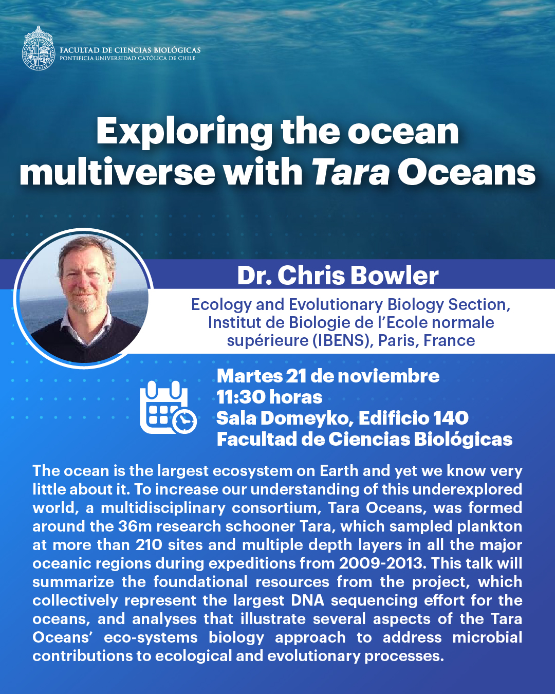 « Todos los Eventos Este evento ha pasado. Exploring the ocean multiverse with Tara Oceans noviembre 21, 2023 @ 11:30 am - 12:30 pm « Consequences of a coast-wide marine pandemic: effects of the loss of the archetypical keystone species Quimioresistencia a cisplatino en cáncer de ovario: Desbalance entre la secreción de exosomas y la función lisosomal » Compartir en...FacebookPinterestTwitterLinkedin + Google Calendar+ Exportar iCal Detalles Fecha: noviembre 21, 2023 Hora: 11:30 am - 12:30 pm Categoría del Evento: Calendario Portada Evento etiquetas:Chris Bowler Lugar Campus Casa Central Campus Casa Central