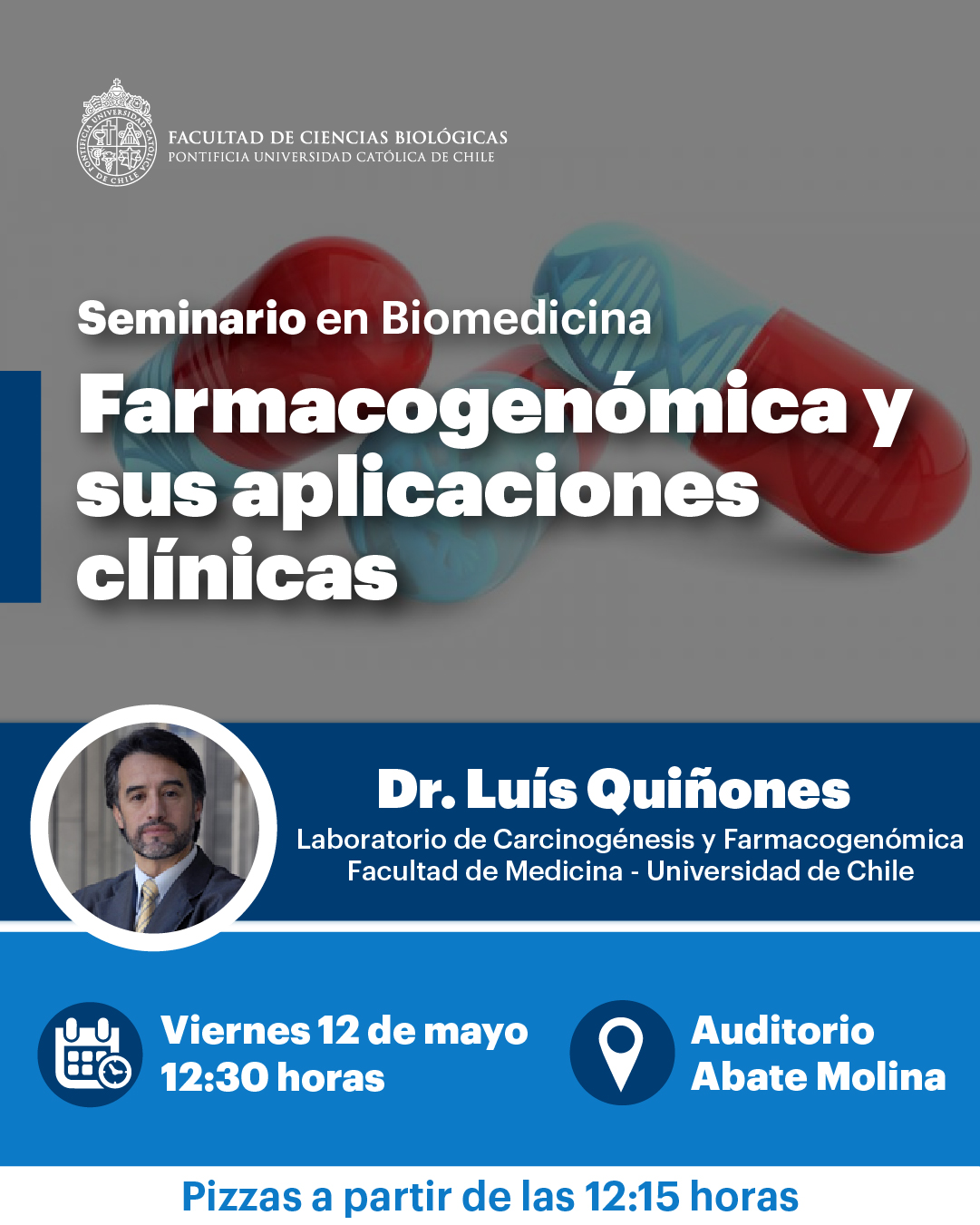 « Todos los Eventos Este evento ha pasado. Farmacogenómica y sus aplicaciones clínicas mayo 12, 2023 @ 12:30 pm - 1:30 pm « Workshop online 1er Ensayo PAES 2023 » Compartir en...FacebookPinterestTwitterLinkedin + Google Calendar+ Exportar iCal Detalles Fecha: mayo 12, 2023 Hora: 12:30 pm - 1:30 pm Categoría del Evento: Calendario Portada Evento etiquetas:Luis Quiñones Lugar Auditorio Abate Molina Auditorio Abate Molina