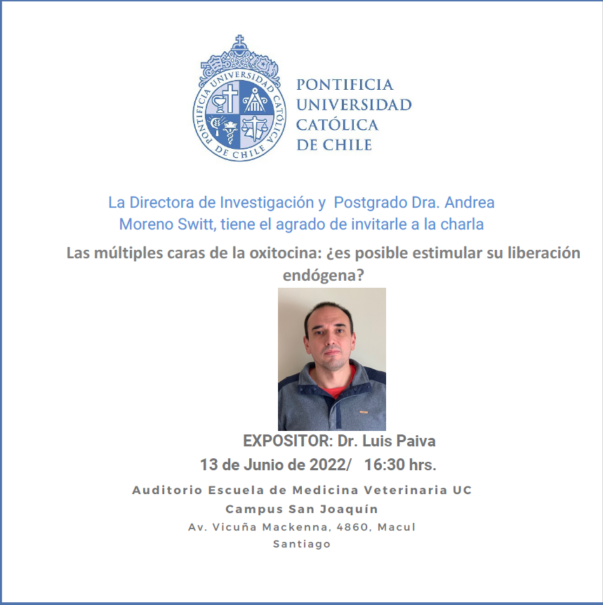 « Todos los Eventos Este evento ha pasado. Las múltiples caras de la oxitocina: ¿es posible estimular su liberación endógena? por el Dr. Luis Paiva junio 13, 2022 @ 4:30 pm - 5:30 pm « Networking Egresad@s Charla Abordaje Seguro de los riesgos químicos y biológicos en laboratorios y procedimiento » Compartir en...FacebookPinterestTwitterLinkedin + Google Calendar+ Exportar iCal Detalles Fecha: junio 13, 2022 Hora: 4:30 pm - 5:30 pm Categoría del Evento: Calendario Portada Evento etiquetas:Medicina Veterinaria Lugar Campus San Joaquín Campus San Joaquín