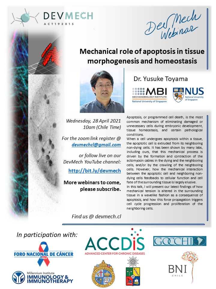 « Todos los Eventos Este evento ha pasado. Mechanical role of apoptosis in tissue morphogenesis and homeostasis abril 28, 2021 @ 10:00 am - 11:00 am « 1° Ciclo de charlas sobre Dolor y Fibromialgia Día de la Transferencia y Propiedad Intelectual en la UC 2021 » Compartir en...FacebookPinterestTwitterLinkedin + Google Calendar+ Exportar iCal Detalles Fecha: abril 28, 2021 Hora: 10:00 am - 11:00 am Categoría del Evento: Calendario Portada Evento etiquetas:IIBM Página Web: https://www.youtube.com/channel/UCGNvjuVrtZxVh1r9-vYmXbA Lugar Online Online