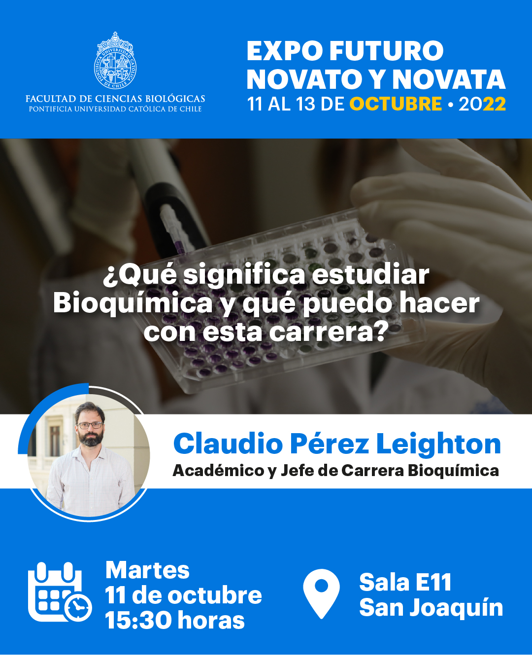 « Todos los Eventos Este evento ha pasado. ¿Qué significa estudiar Bioquímica y qué puedo hacer con esta carrera? octubre 11, 2022 @ 3:30 pm - 4:30 pm « El desafío de cultivar carne en el laboratorio… ¿Qué significa estudiar Biología y qué puedo hacer con esta carrera? » Compartir en...FacebookPinterestTwitterLinkedin + Google Calendar+ Exportar iCal Detalles Fecha: octubre 11, 2022 Hora: 3:30 pm - 4:30 pm Categoría del Evento: Calendario Portada Evento etiquetas:Expo Futuro Novato y Novata Lugar Sala E11 San Joaquín Sala E11 San Joaquín Organizador Pregrado