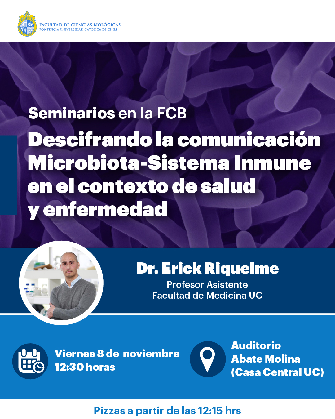 « Todos los Eventos Este evento ha pasado. Seminario: Descifrando la comunicación Microbiota-Sistema Inmune noviembre 8, 2024 @ 12:30 pm - 2:00 pm « Plazo postulaciones intercambio UC 2025-2 Charla: Traits, Evolution, and the Functional Assembly of Biomes » Compartir en...FacebookPinterestTwitterLinkedin + Google Calendar+ Exportar iCal Detalles Fecha: noviembre 8, 2024 Hora: 12:30 pm - 2:00 pm Categoría del Evento: Calendario Portada Evento etiquetas:Seminario Lugar Auditorio Abate Molina Auditorio Abate Molina