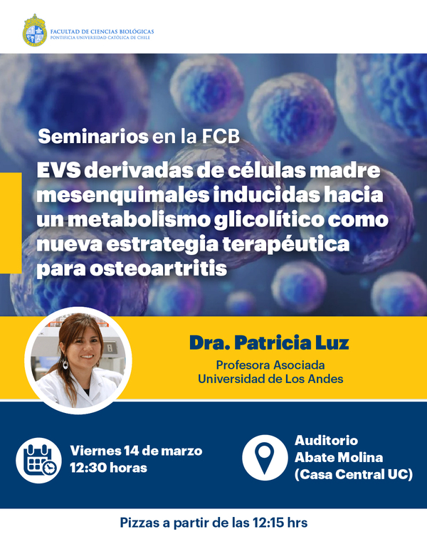 « Todos los Eventos Este evento ha pasado. Seminario: “EVS derivadas de células madre mesenquimales inducidas hacia un metabolismo glicolítico como nueva estrategia terapéutica para osteoartritis” marzo 14 @ 12:00 pm - 2:00 pm « Empresas con impacto: mujeres liderando negocios sostenibles Cambio comité de representantes de postgrado » Compartir en...FacebookPinterestTwitterLinkedin + Google Calendar+ Exportar iCal Detalles Fecha: marzo 14 Hora: 12:00 pm - 2:00 pm Categoría del Evento: Calendario Portada Evento etiquetas:Seminarios en la FCB Lugar Auditorio Abate Molina Auditorio Abate Molina