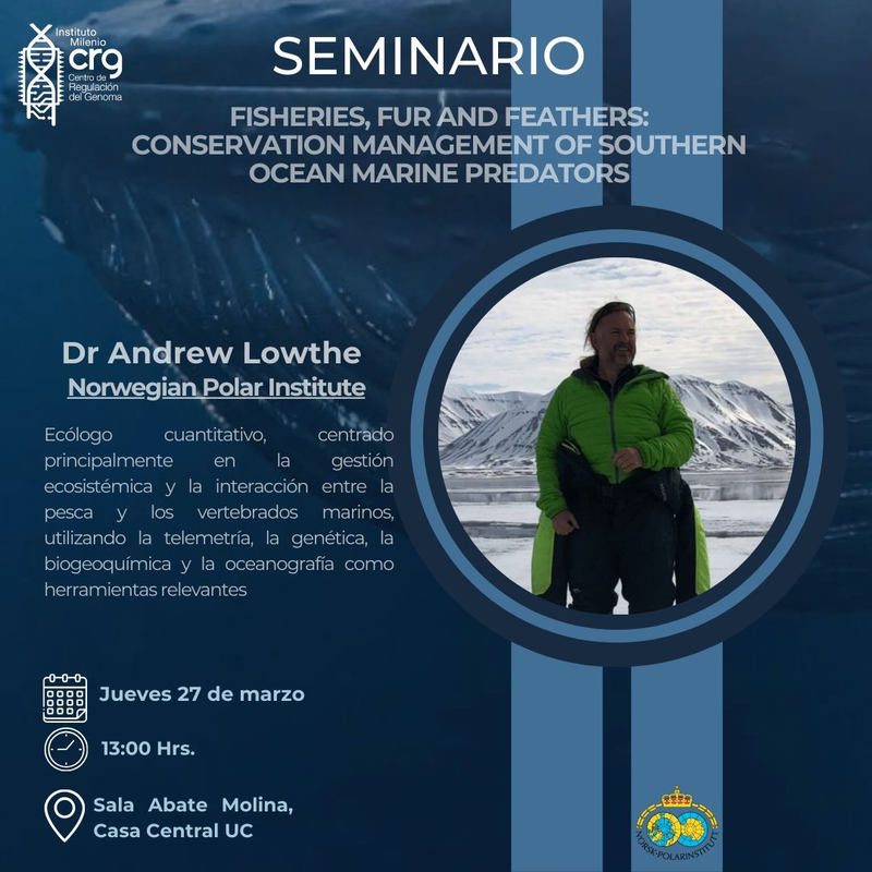 « Todos los Eventos Este evento ha pasado. Seminario “Fisheries, Fur and Feathers: Conservation Management of Southern Ocean Marine Predators” marzo 27 @ 1:00 pm - 2:30 pm « Seminario “Perspectivas desde la retina: revelando el envejecimiento y las enfermedades neurodegenerativas” Seminario “From biology to patient care: the tumor microenvironment as a key driver in cancer prognosis and treatment” » Compartir en...FacebookPinterestTwitterLinkedin + Google Calendar+ Exportar iCal Detalles Fecha: marzo 27 Hora: 1:00 pm - 2:30 pm Categoría del Evento: Calendario Portada Evento etiquetas:Seminario Lugar Auditorio Abate Molina Auditorio Abate Molina