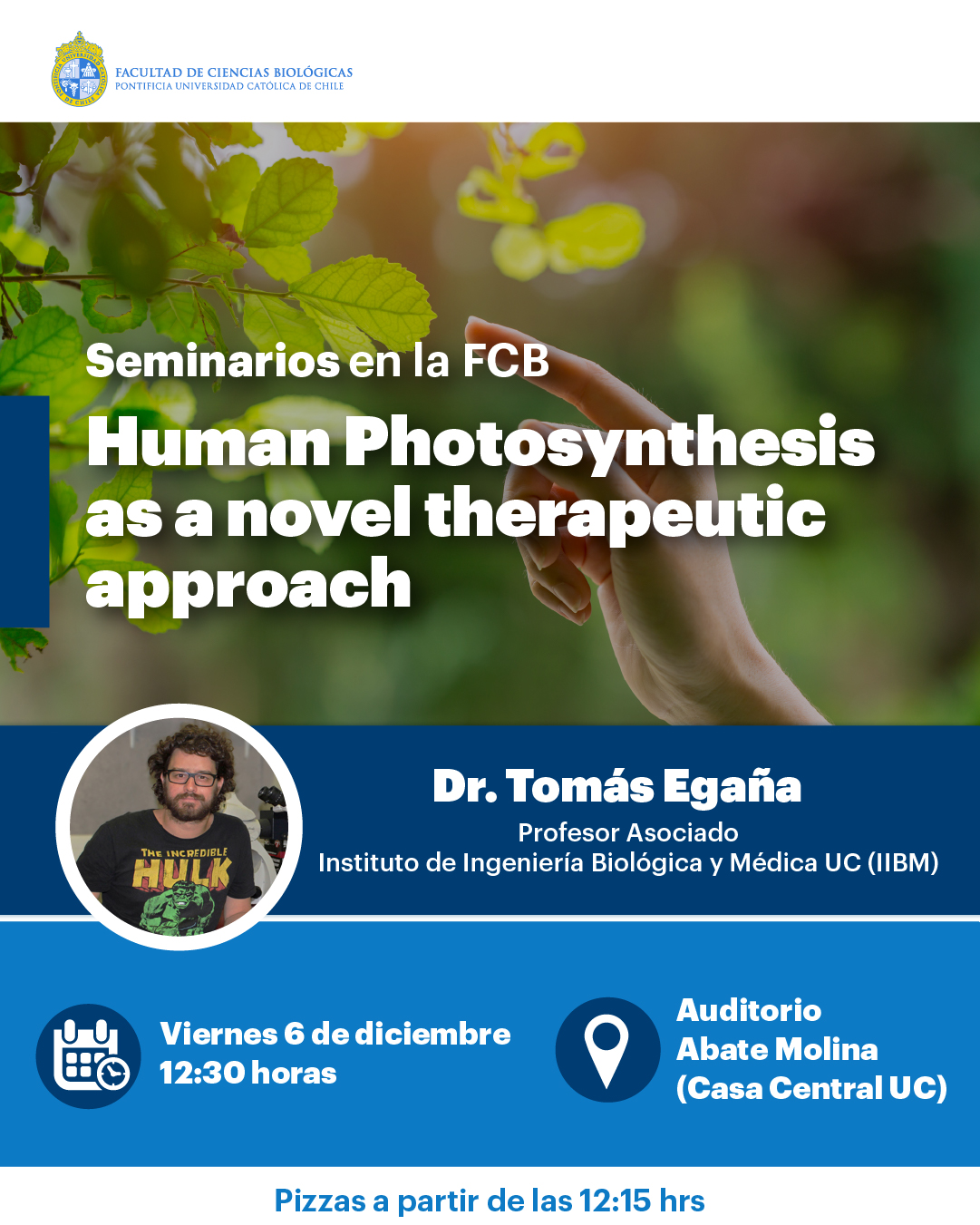 « Todos los Eventos Este evento ha pasado. Seminario: Human photosynthesis as a novel therapeutic approach diciembre 6, 2024 @ 12:30 pm - 1:30 pm « Proyecto de Tesis en 3 minutos. Cambio de mando Centro de Estudiantes de Pregrado » Compartir en...FacebookPinterestTwitterLinkedin + Google Calendar+ Exportar iCal Detalles Fecha: diciembre 6, 2024 Hora: 12:30 pm - 1:30 pm Categoría del Evento: Calendario Portada Evento etiquetas:Seminario Lugar Auditorio Abate Molina Auditorio Abate Molina