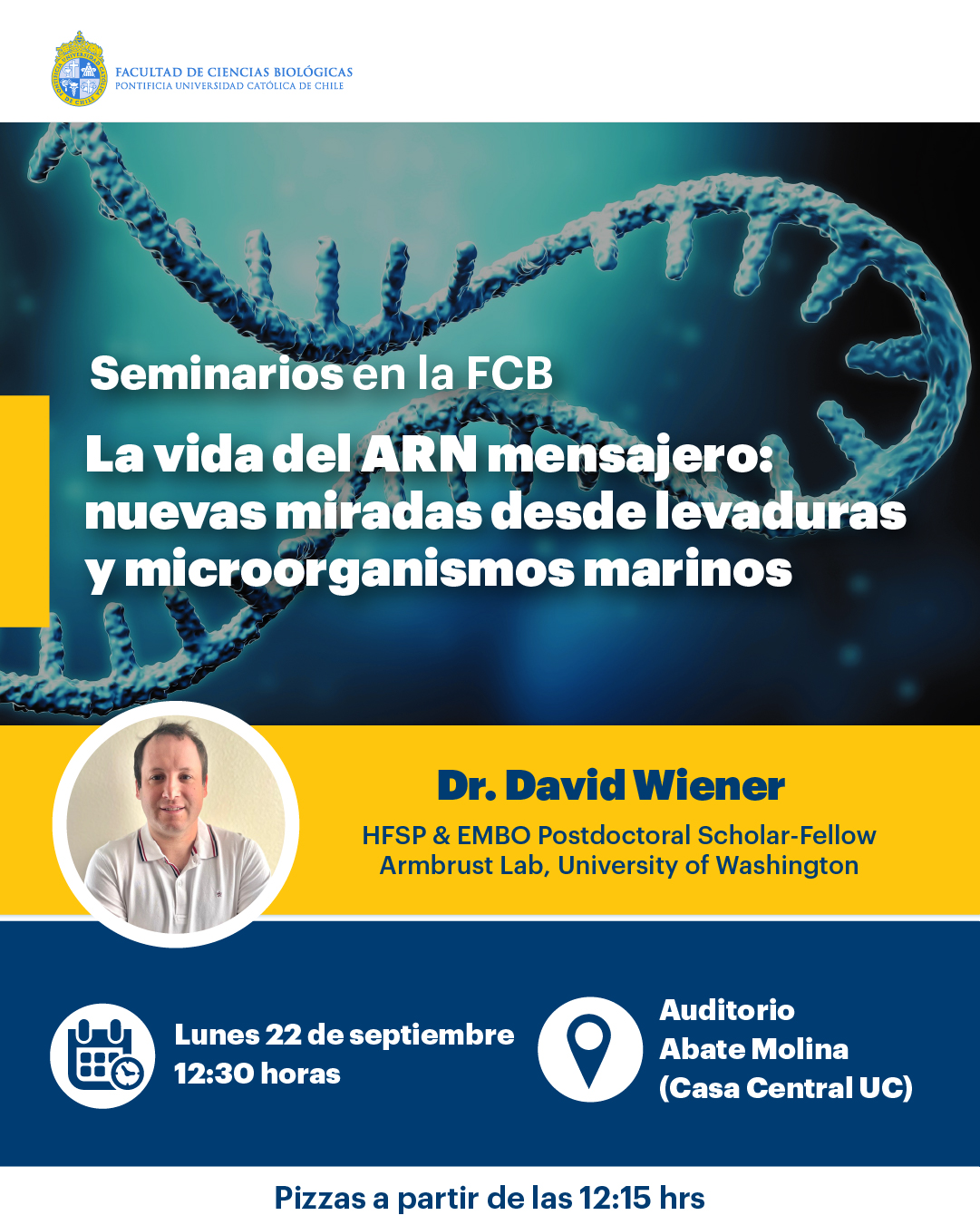 « Todos los Eventos Este evento ha pasado. Seminario “La vida del ARN mensajero: nuevas miradas desde levaduras y microorganismos marinos” septiembre 22 @ 12:30 pm - 2:00 pm « Seminario: “Rol del Lateral Septum en el control de la alimentación. Implicancias en el desarrollo de obesidad” Jornada de presentación del grupo Resiliencia en Biología Celular y Tisular (Rebicet) » Compartir en...FacebookPinterestTwitterLinkedin + Google Calendar+ Exportar iCal Detalles Fecha: septiembre 22 Hora: 12:30 pm - 2:00 pm Categoría del Evento: Calendario Portada Evento etiquetas:Seminarios en la FCB Lugar Campus Casa Central Campus Casa Central