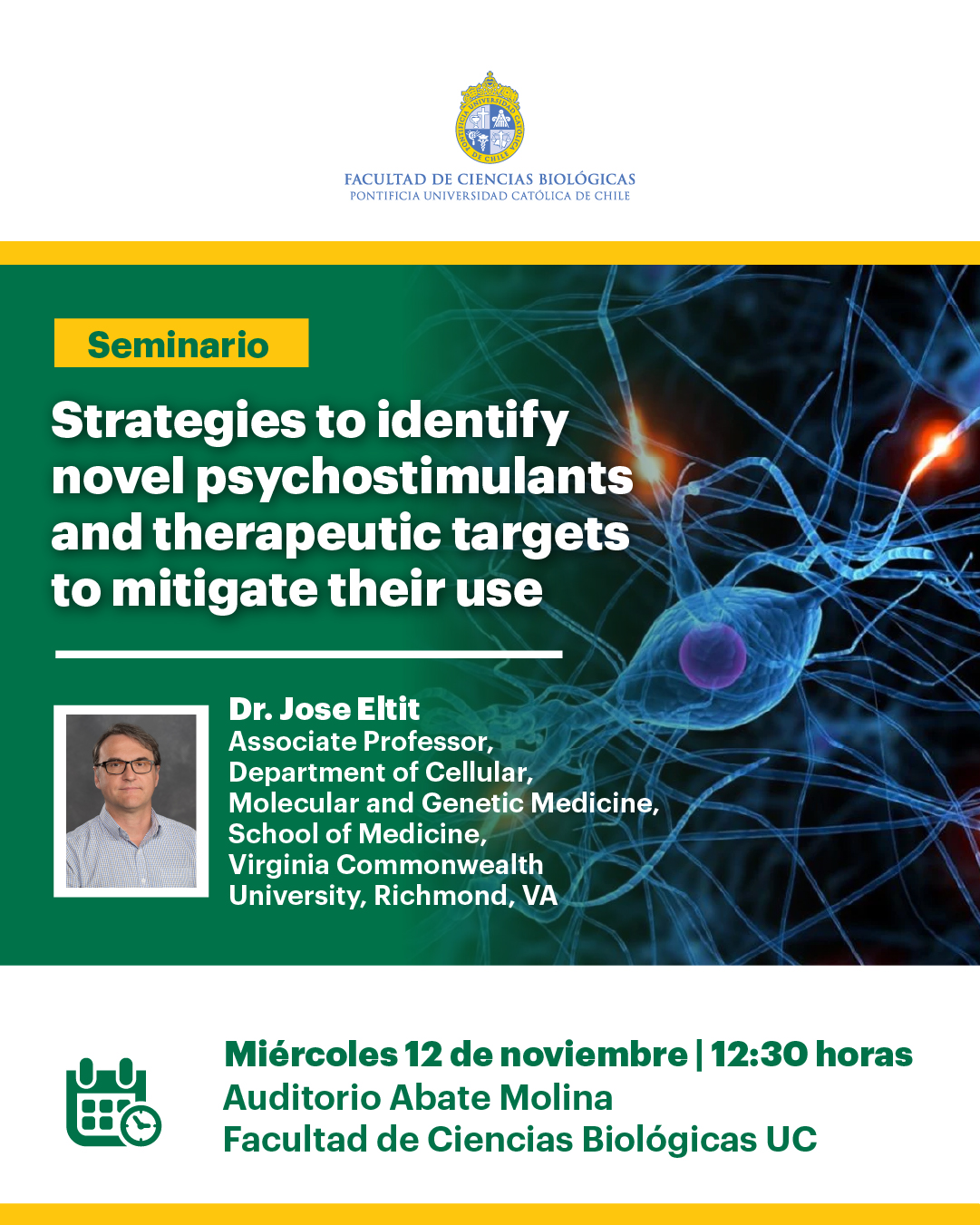 « Todos los Eventos Este evento ha pasado. Seminario “Strategies to identify novel psychostimulants and therapeutic targets to mitigate their use” noviembre 12 @ 12:30 pm - 1:30 pm « Charla nueva malla carrera Biología Marina Seminario “Is protein synthesis a local brake for the regeneration of cortical axons?” » Compartir en...FacebookPinterestTwitterLinkedin + Google Calendar+ Exportar iCal Detalles Fecha: noviembre 12 Hora: 12:30 pm - 1:30 pm Categoría del Evento: Calendario Portada Evento etiquetas:Seminarios Lugar Campus Casa Central Campus Casa Central
