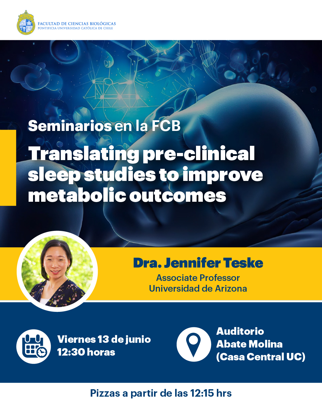 « Todos los Eventos Este evento ha pasado. Seminario “Translating pre-clinical sleep studies to improve metabolic outcomes” junio 13 @ 12:00 pm - 1:30 pm « Encuentro Alumni UC “Desafíos para los nuevos tiempos: diálogo con el Rector Juan Carlos de la Llera” Charla “El rol social de la ciencia más allá de sus productos” con Gabriel León » Compartir en...FacebookPinterestTwitterLinkedin + Google Calendar+ Exportar iCal Detalles Fecha: junio 13 Hora: 12:00 pm - 1:30 pm Categoría del Evento: Calendario Portada Evento etiquetas:Seminarios en la FCB Lugar Auditorio Abate Molina Auditorio Abate Molina