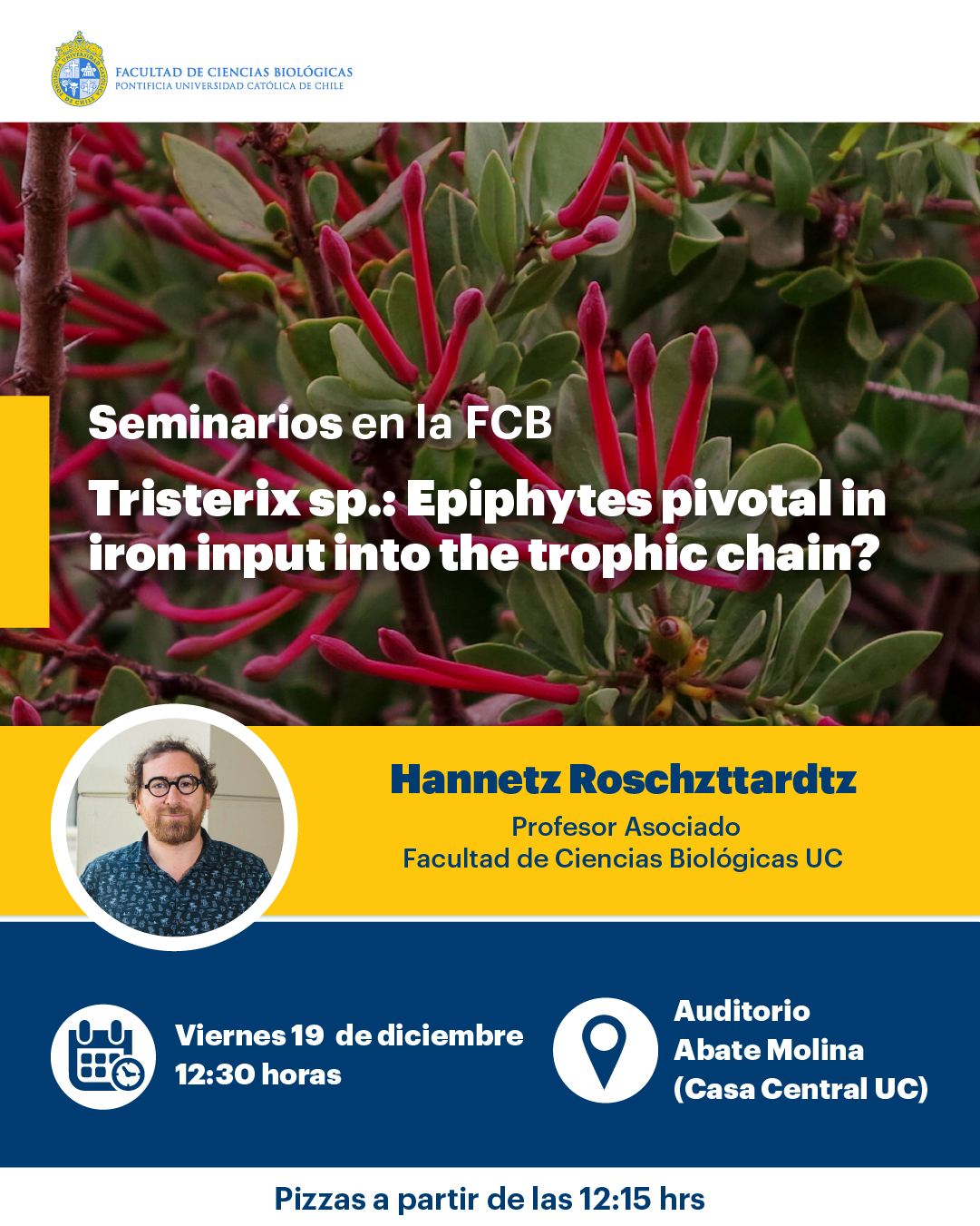 « Todos los Eventos Seminario “Tristerix sp.: Epiphytes pivotal in iron input into the trophic chain?” diciembre 19 @ 12:30 pm - 1:30 pm « Seminario “Planificación e Instalación de un Biobanco en Chile: Experiencias y Desafíos” Compartir en...FacebookPinterestTwitterLinkedin + Google Calendar+ Exportar iCal Detalles Fecha: diciembre 19 Hora: 12:30 pm - 1:30 pm Categoría del Evento: Calendario Portada Evento etiquetas:Seminarios en la FCB Lugar Campus Casa Central Campus Casa Central