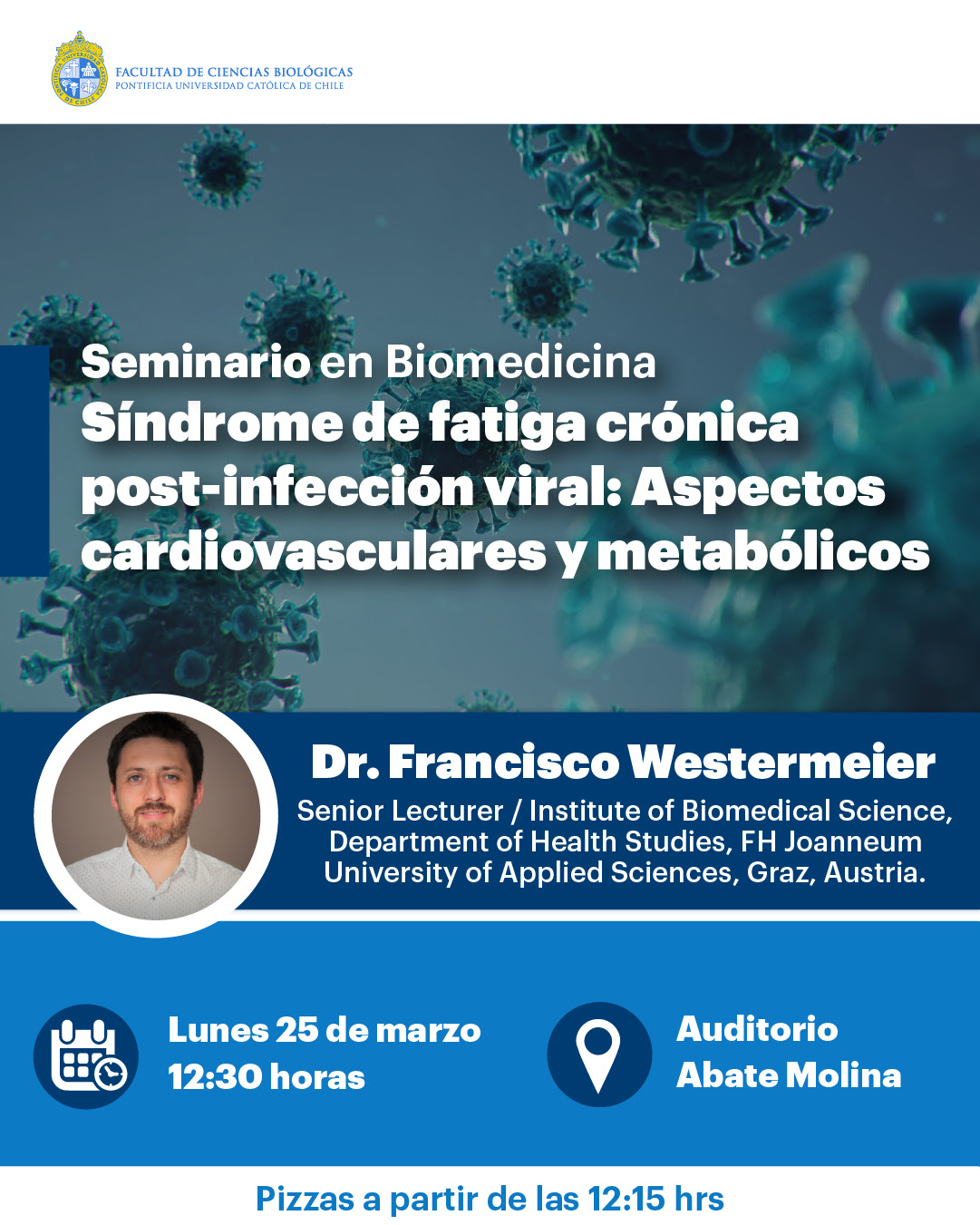 « Todos los Eventos Este evento ha pasado. Síndrome de fatiga crónica post-infección viral: Aspectos cardiovasculares y metabólicos marzo 25, 2024 @ 12:30 pm - 1:30 pm « Recibamos el 2024 en el Doctorado Defensa pública de Tesis Doctoral: Relación virus-hospedero en ambientes termales » Compartir en...FacebookPinterestTwitterLinkedin + Google Calendar+ Exportar iCal Detalles Fecha: marzo 25, 2024 Hora: 12:30 pm - 1:30 pm Categoría del Evento: Calendario Portada Evento etiquetas:Seminario Lugar Auditorio Abate Molina Auditorio Abate Molina