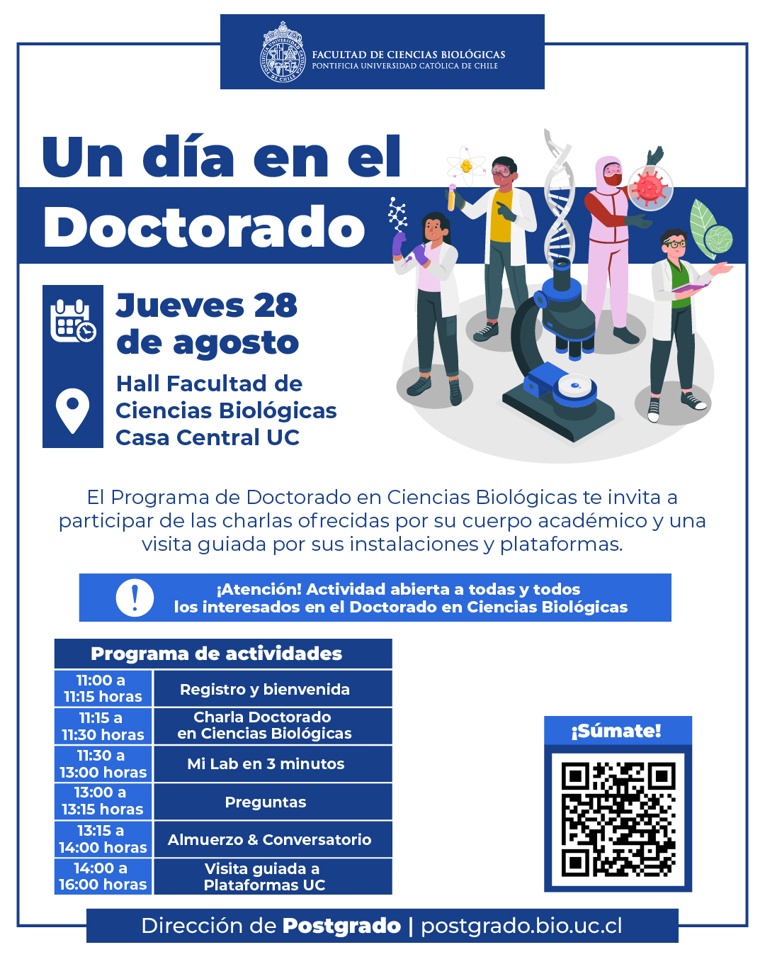 « Todos los Eventos Este evento ha pasado. Un día en el Doctorado agosto 28 @ 11:00 am - 4:00 pm « Seminario “Patrimonio natural de la comuna de Purranque: una mirada a la biodiversidad del sur de Chile” Academia que impacta. Primera sesión “Del paper a la pantalla” » Compartir en...FacebookPinterestTwitterLinkedin + Google Calendar+ Exportar iCal Detalles Fecha: agosto 28 Hora: 11:00 am - 4:00 pm Categoría del Evento: Calendario Portada Evento etiquetas:Postgrado Lugar Campus Casa Central Campus Casa Central