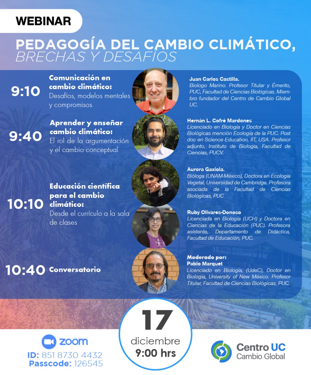 « Todos los Eventos Este evento ha pasado. Webinar: Pedagogía del Cambio Climático diciembre 17, 2021 @ 9:00 am - 11:00 pm « Hacia la soberanía tecnológica: desarrollo e implementación de herramientas abiertas para la ciencia Coloquio: Desafíos que surgen de la COP26 para las Instituciones de Educación Superior » Compartir en...FacebookPinterestTwitterLinkedin + Google Calendar+ Exportar iCal Detalles Fecha: diciembre 17, 2021 Hora: 9:00 am - 11:00 pm Categoría del Evento: Calendario Portada Evento etiquetas:Centro Cambio Global UC Página Web: https://reuna.zoom.us/j/85187304432?pwd=Vi9lTGdyVHVDNjFJQWdoQVhhbFNIQT09#success Lugar Online Online