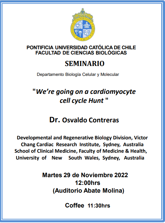 « Todos los Eventos Este evento ha pasado. We’re going on a cardiomyocyte cell cycle Hunt noviembre 29, 2022 @ 12:00 pm - 1:00 pm « Desde la edad media de COVID-19 al renacimiento por la vacunación Mujeres en ciencia, tecnología e innovación » Compartir en...FacebookPinterestTwitterLinkedin + Google Calendar+ Exportar iCal Detalles Fecha: noviembre 29, 2022 Hora: 12:00 pm - 1:00 pm Categoría del Evento: Calendario Portada Evento etiquetas:Osvaldo Contreras Lugar Auditorio Abate Molina Auditorio Abate Molina