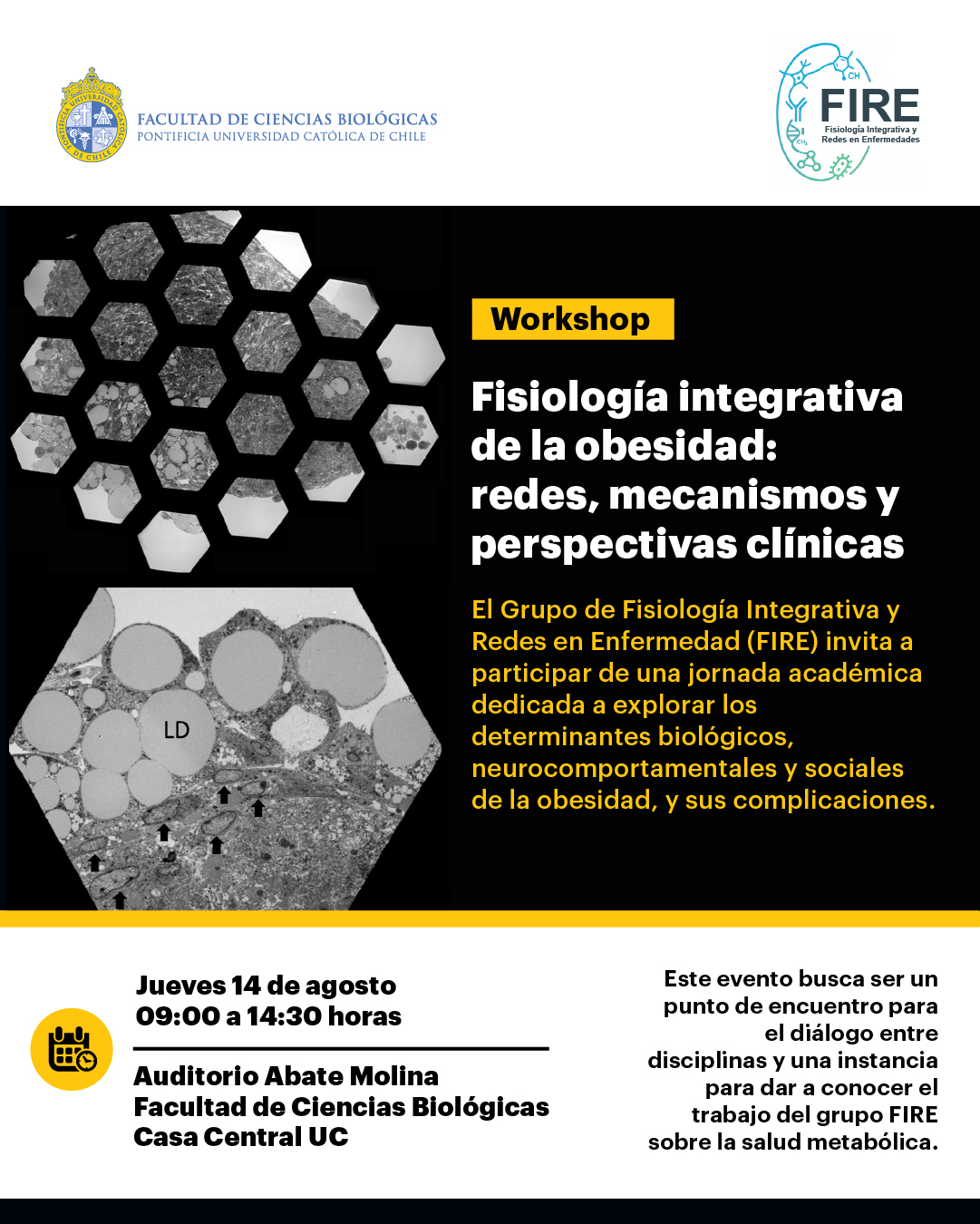 « Todos los Eventos Este evento ha pasado. Workshop “Fisiología integrativa de la obesidad: redes, mecanismos y perspectivas clínicas” agosto 14 @ 9:30 am - 2:30 pm « Taller de metodologías participativas para vinculación con comunidades educativas Laboratorios abiertos » Compartir en...FacebookPinterestTwitterLinkedin + Google Calendar+ Exportar iCal Detalles Fecha: agosto 14 Hora: 9:30 am - 2:30 pm Categoría del Evento: Calendario Portada Evento etiquetas:Grupos de investigacion Lugar Campus Casa Central Campus Casa Central