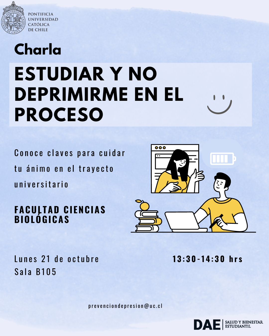 Charla DAE: Estudiar y no deprimirme en el proceso | 21 de octubre a las 13:30 hrs en la B105.