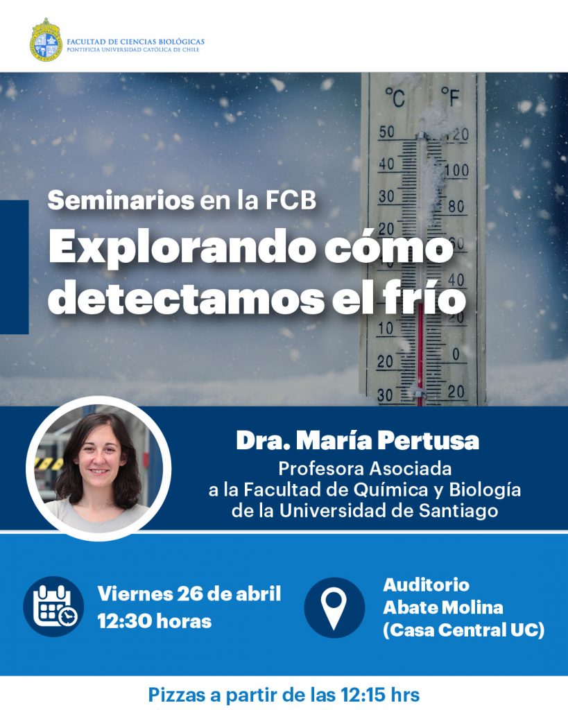 Este próximo viernes 26 de abril, desde las 12:15 horas, nos acompañará la Dra. María Pertusa, especialista en neurociencia y académica de la Universidad de Santiago; y quien investiga el canal de iones responsable de la detección del frío en las neuronas sensoriales (TRPM8). Para la Dra. Pertusa, los alcances de este tipo de investigación podrían dar luces a tratamientos de diversa índole en lo que respecta a tumores y células cancerosas.