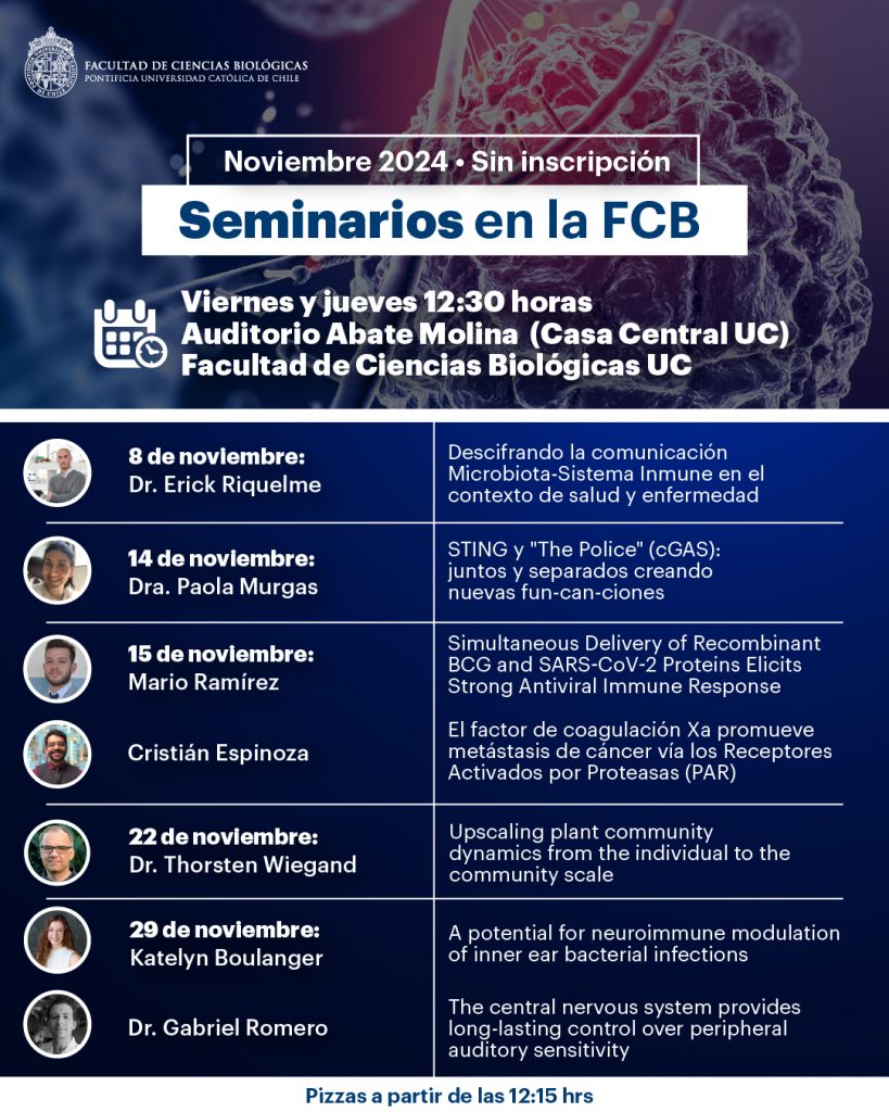 Cada charla se realizará en formato presencial, en el Auditorio Abate Molina, ubicado en las dependencias de la Facultad de Ciencias Biológicas de Casa Central UC (Av. Libertador Bernardo O’Higgins, 340). Cabe destacar que cada instancia iniciará con una conversación previa, en donde se regalarán pizzas a las y los asistentes.