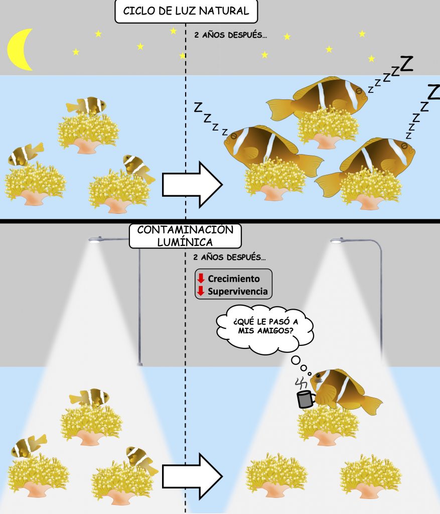 El autor principal del trabajo publicado en la revista científica Proceedings of the Royal Society B, re afirma la tesis: “Los peces payaso pueden vivir en aguas costeras poco profundas y son muy sedentarios al vivir en anémonas, por lo que pueden verse fácilmente afectados por la luz nocturna procedente de faroles, muelles o puertos. Como muchos otros peces de arrecife, los payaso se alimentan, se reproducen, defienden sus territorios e interactúan con otros peces durante el día, y se recuperan mientras duermen por la noche”.