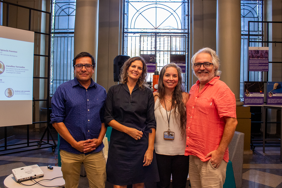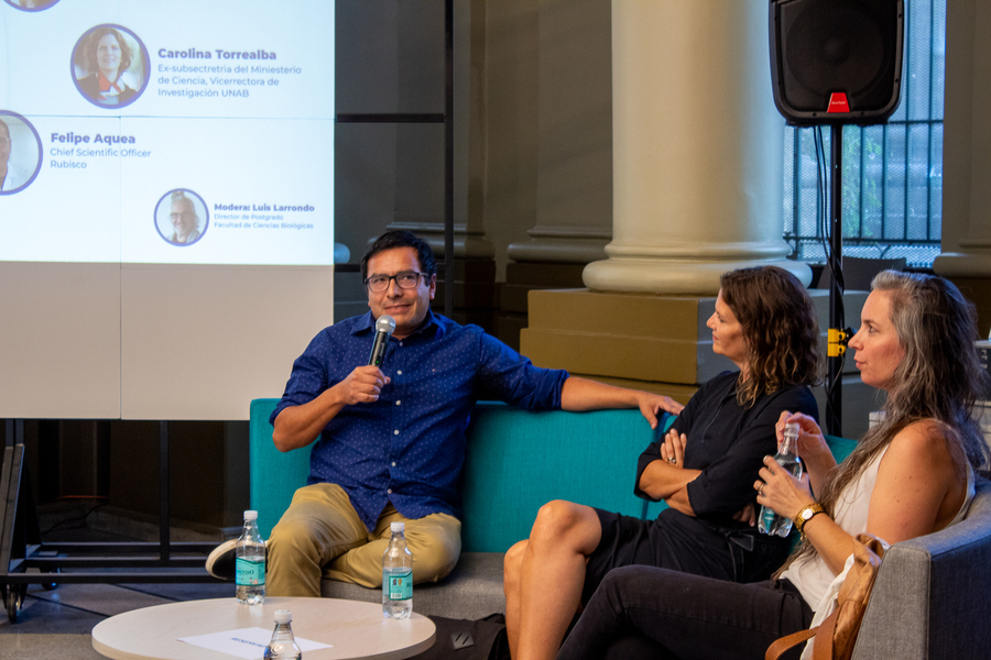 La académica UC, María Ignacia Fuentes, la ex subsecretaria del Ministerio de Ciencia, Carolina Torrealba, y el director científico de Rubisco, Felipe Aquea, fueron los panelistas que participaron del conversatorio “Doctorado: la ciencia fuera de la ciencia”, que se realizó en la bienvenida de postgrado y que moderó el Dr. Luis Larrondo.