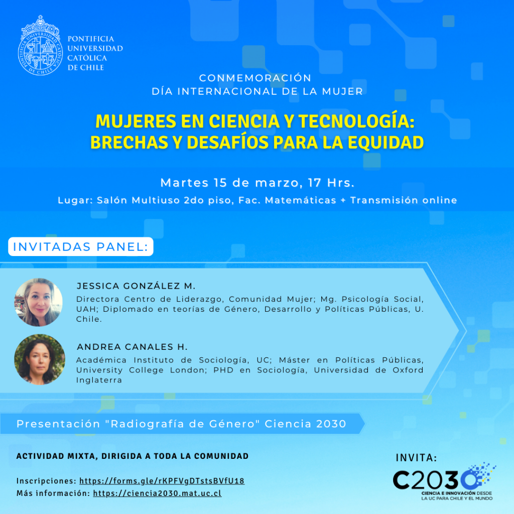 Martes 15 de marzo, 17:00 horas, Campus San Joaquín. Panel “Mujeres en Ciencia y Tecnología: Brechas y desafíos para la equidad”, del Eje de Liderazgo Femenino y Equidad de Género del Proyecto Ciencia 2030 UC.