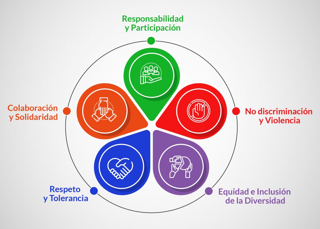 Estos valores se definieron en conjunto con miembros de todos los estamentos de la Facultad en la Jornada de enero 2021 y son: Responsabilidad y Participación, la Colaboración y Solidaridad, el Respeto y Tolerancia, la No Discriminación y Violencia, y la Equidad e Inclusión de la Diversidad.